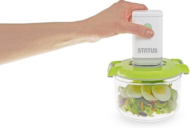 Elektrická vákuová pumpa je určená pre 100% odsatie nadbytočného vzduchu nielen vo všetkých Status boxoch a džbánoch, ale aj v ostatných systémoch využívajúcich vákuové zátky či kliky. Pre odsatie vzduchu jednoducho umiestnite pumpu na silikónovú zátku a stlačte tlačidlo. Proces vákuovania je signalizovaný striedavým červeným a zeleným svetlom, ktoré sa po úspešnom odsatí vzduchu vypne. Týmto spôsobom sú potraviny zavákuované v priebehu niekoľkých sekúnd.