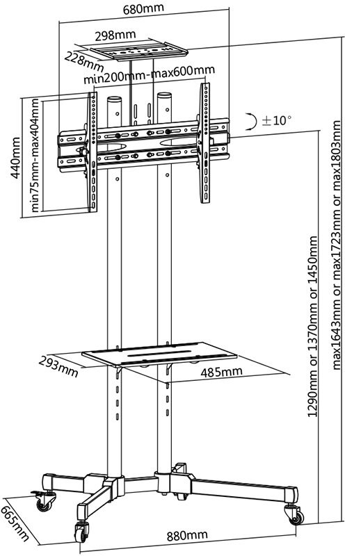 Podlahový stojan na TV, min. uhlopriečka obrazovky 40", max. uhlopriečka obrazovky 70", náklon +10°/-10°, maximálna nosnosť 50 kg, minimálna rozteč 75x200 mm, maximálna rozteč 600x404 mm, materiál oceľ, "poistka" proti vysadeniu.Vlastnosti