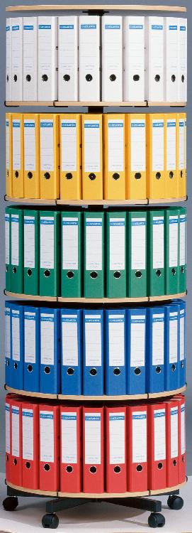 Stojan s individuálne otočnými policami, vrchnou policou a podstavcom na kolieskach. Maximálna kapacita 30 zakladačov na jednej polici. Dodávaný v rozloženom stave ako kovové telo a police. Farba stojana čierna, farba políc svetlosivá.Priemer: 850 mm