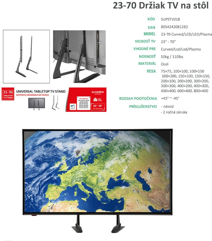 Pevný kovový držiak určený na stôl. Vďaka tomuto držiaku môžete na Váš stôl alebo skrinku umiestniť TV s uhlopriečkou od 23" - 70" (58cm - 177cm). Vďaka vysokej nosnosti je vhodný skoro pre všetky druhy TV. Vyhotovenie je kov v čiernej farbe.