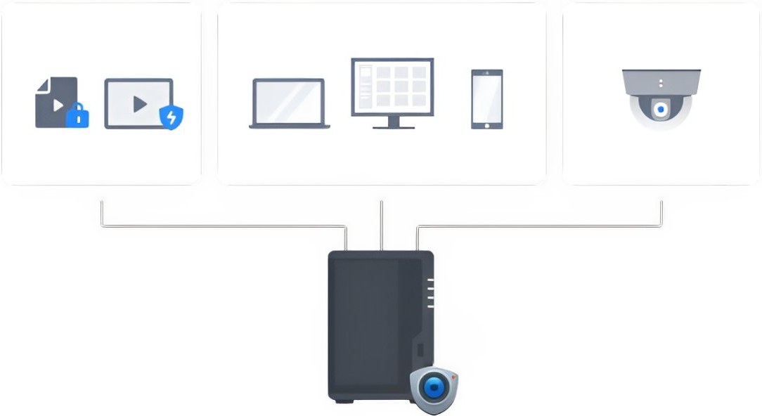 Zariadenie podporuje komplexné zálohovacie riešenia pre počítače, servery aj cloudové služby. Okrem toho je kompatibilné s platformou Synology Surveillance Station, ktorá umožňuje pripojenie až 25 IP kamier a poskytuje pokročilé možnosti monitorovania, nahrávania a správy záznamov. Vďaka podpore šifrovania a zálohovaniu do cloudu sú vaše dáta v bezpečí aj pri fyzickom poškodení zariadenia.