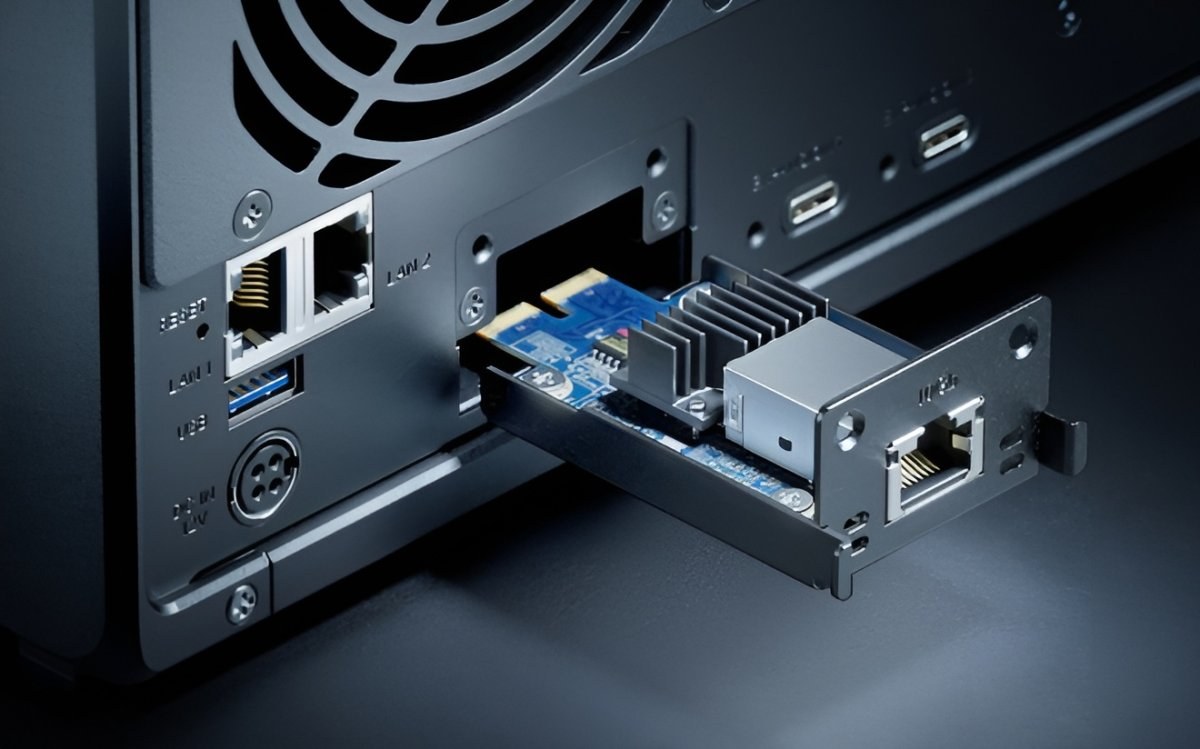Zariadenie je vybavené dvoma vstavanými 2.5GbE portmi, ktoré umožňujú vysokorýchlostný prenos dát až do 1 181 MB/s pri čítaní a 1 180 MB/s pri zápise. Pre ešte vyššiu priepustnosť je možné DS1525+ rozšíriť o 10GbE konektivitu pomocou voliteľného modulu Synology E10G22-T1-Mini. To z neho robí ideálne riešenie pre náročné aplikácie ako sú virtualizácia, správa veľkých multimediálnych knižníc alebo zálohovanie viacerých zariadení.