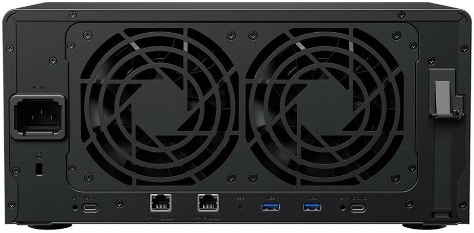 Zariadenie je vybavené dvoma vstavanými 2.5GbE sieťovými portami, ktoré umožňujú prenosové rýchlosti až 2 239 MB/s pri čítaní a 1 573 MB/s pri zápise. Pre ešte vyšší výkon je možné pridať rozširujúce sieťové karty s podporou 10GbE alebo až 25GbE. DS1825+ podporuje aj M.2 NVMe SSD disky cez dva integrované sloty, ktoré možno využiť ako cache pre zrýchlenie prístupu k často používaným dátam.