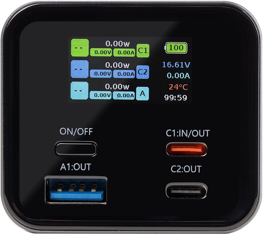 Žiadne dohady. Vždy presne vieš, čo sa deje. Integrovaný TFT displej zobrazuje: aktuálne vstupné/výstupné výkon, stav batérie a priebeh nabíjania. Nabíjaj viac zariadení súčasne bez straty výkonu. 2× USB-C pre moderné vysokorýchlostné nabíjanie, 1 x USB-A port.
