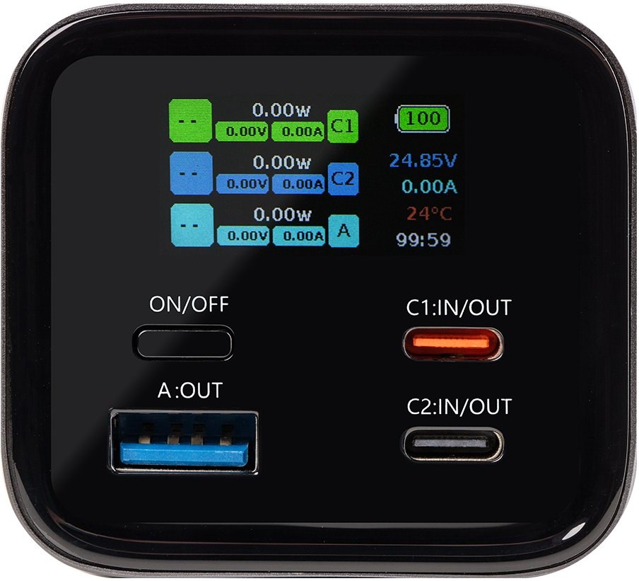 Žiadne dohady. Vždy presne vieš, čo sa deje. Integrovaný TFT displej zobrazuje: aktuálne vstupné/výstupné výkon, stav batérie a priebeh nabíjania. Nabíjaj viac zariadení súčasne bez straty výkonu. 2× USB-C pre moderné vysokorýchlostné nabíjanie, 1 x USB-A port.