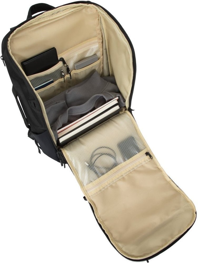 Batoh tiež ponúka funkciu horného a predného nakladania, vonkajší priestor na obuv, predné a bočné madlá na uchopenie, remienok na vozík, aby ste ho mohli pripevniť k svojej batožine, a naťahovacie pútko na bundu.