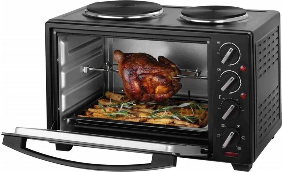 Táto mini elektrická kompaktná rúra ponúka pohodlie rúry malej veľkosti, bez toho, aby sa obmedzil jej výkon. Táto elektrická rúra má kapacitu 32 litrov a ponúka celkom 5 režimov pečenia (konvekčné, tradičné, grilovanie, otočný tanier, otočný tanier s konvekciou). Na hornej strane sa nachádzajú dve platničky, ktoré vám pomôžu pripraviť celú radu lahodných receptov.Technické parametre: