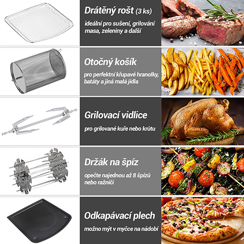 TESLA AirCook & Grill QG700 je dodávaná s bohatým příslušenstvím, které přináší široké možností využití pro vaše vaření - 3 drátěné rošty, otočný fritovací košík, grilovací vidlice, odnímatelný držák, držák na špíz/ražniči a barevnou tištěnou kuchařkou s recepty. Vyjímatelné části je možné mýt v myčce na nádobí.