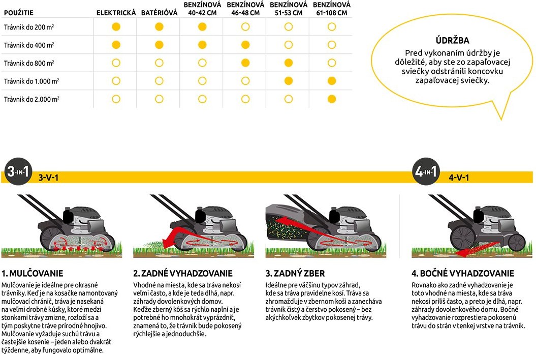 je váš trávnik, aké funkcie by mal mať stroj (3-v-1/4-v-1) a aké funkcie potrebujete.