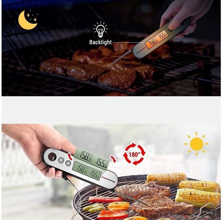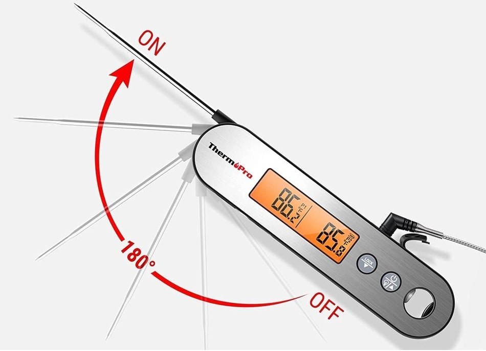 Digitálny teplomer ThermoPro TP610 má veľký prehľadný displej. Tento model teplomera má dve sondy. Jeden z nich je možné priamo zložiť do tela teplomera. Druhá sonda je drôtová a je vhodná na pečenie mäsa, napr. v rúre alebo na grile.Skladacia sonda