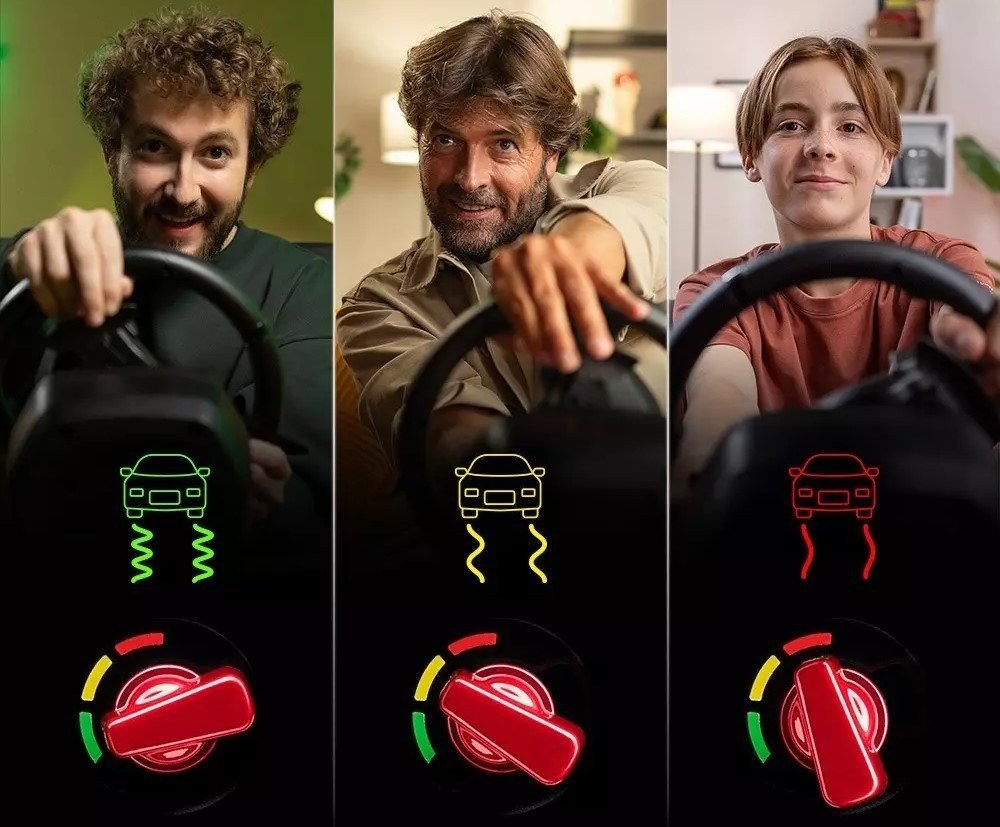 Technológia bungee cord poskytuje automatické vystreďovanie a konzistentný odpor počas celého rozsahu otáčania (240°). Výsledkom je prirodzené a presné ovládanie vozidla v každej zákrute.Technológia H.E.A.R.T