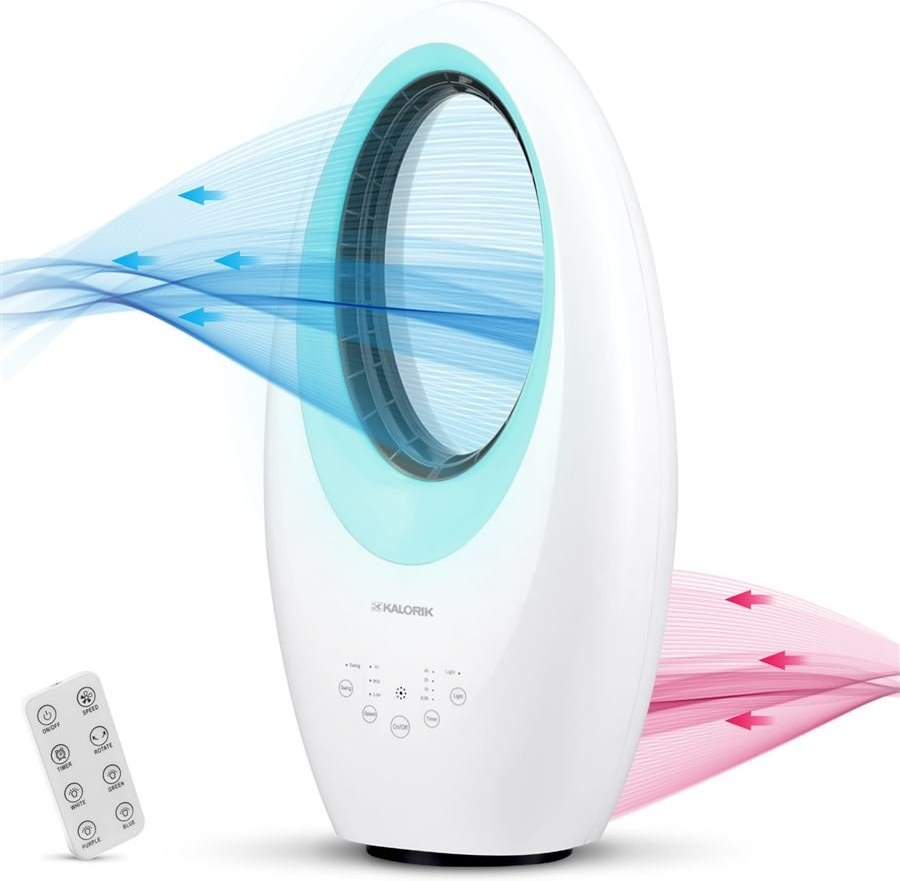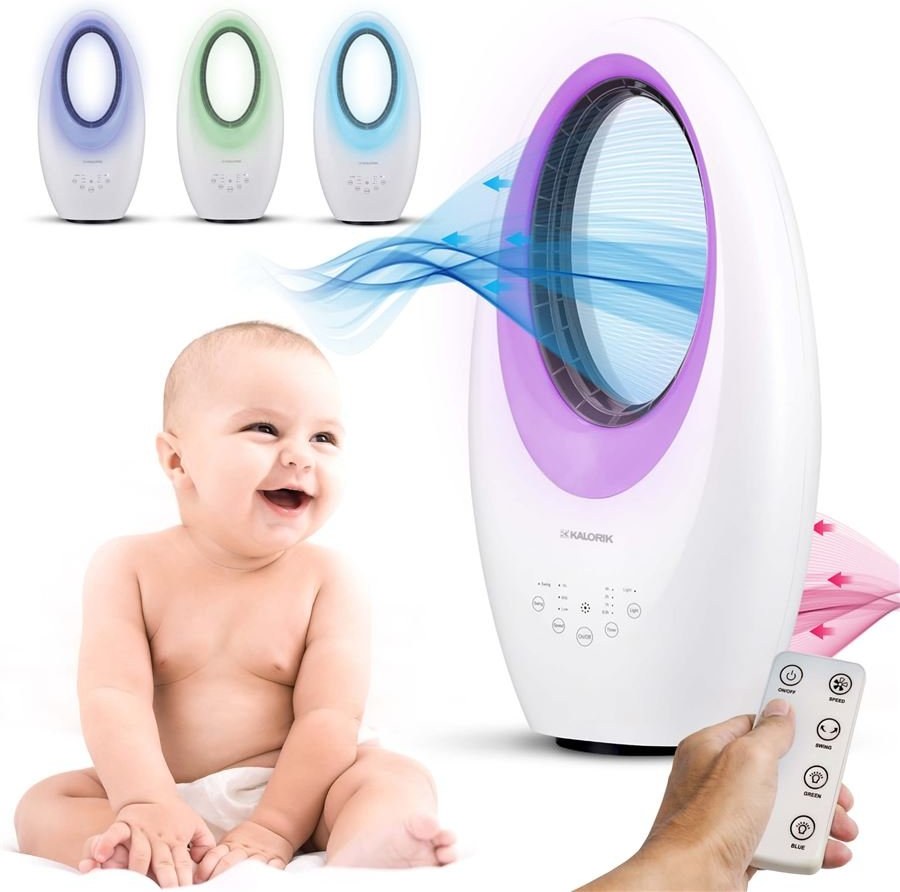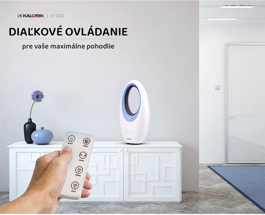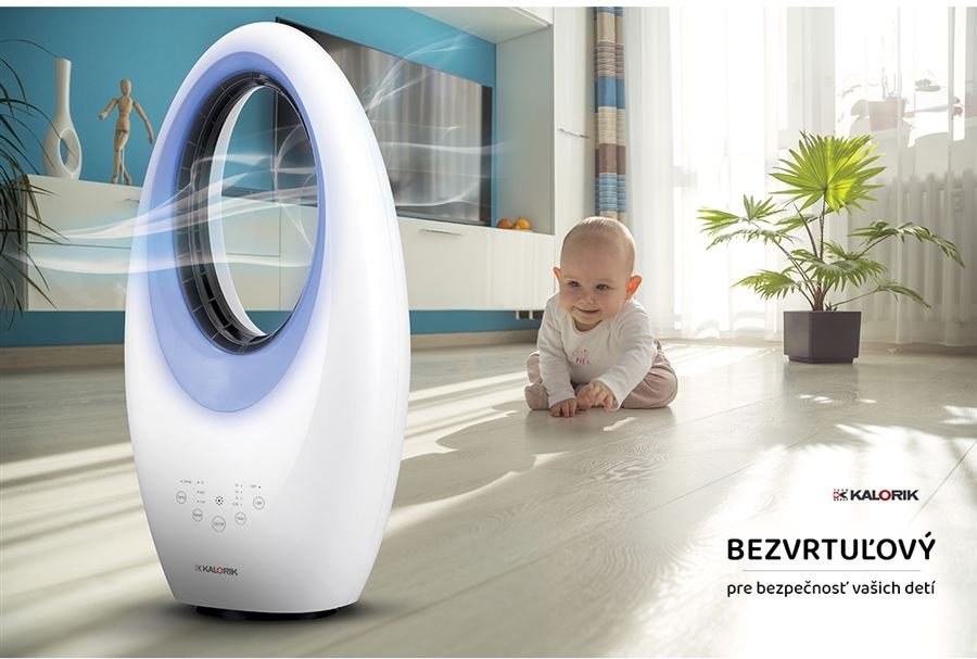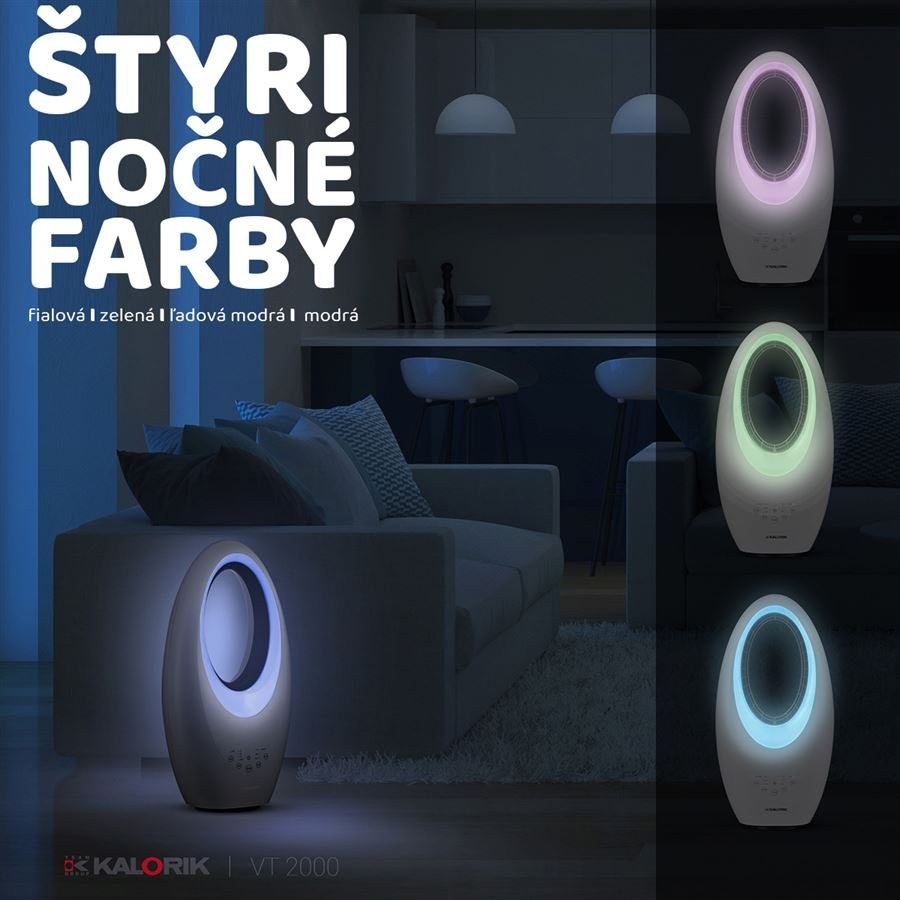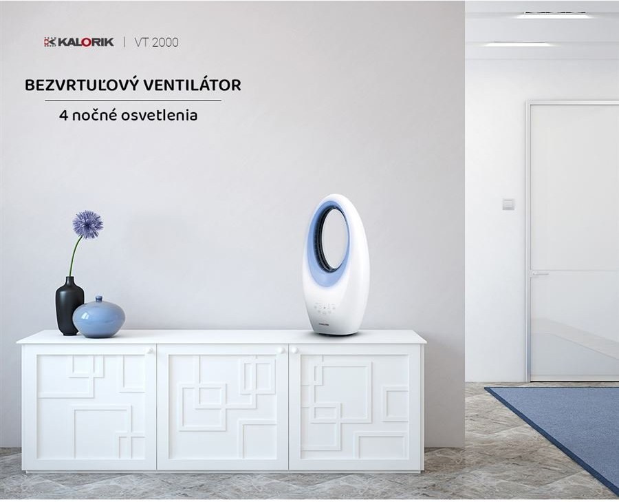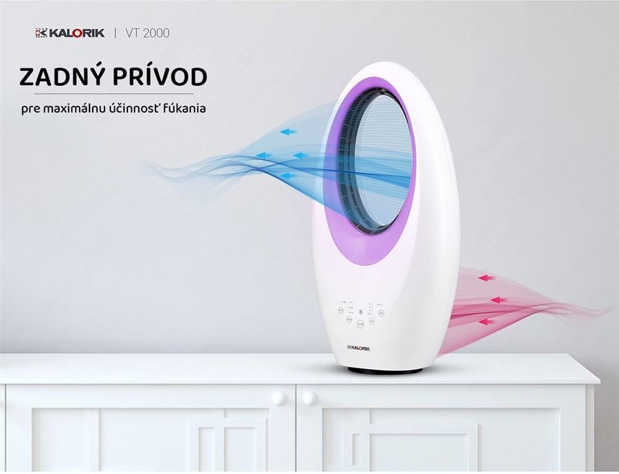 Belgická značka Kalorik Group bola založená už v roku 1930 a špecializuje sa na výrobu malých domácich spotrebičov. Výrobky tejto značky majú vynikajúce meno v mnohých európskych krajinách. Bezvrtuľový ventilátor TKG VT2000 ponúka vysokú rýchlosť cirkulácie vzduchu, možnosť využitia časovača a tiež originálnu možnosť nočného osvetlenia v 4 farbách: fialové, zelené, ľadovo modré, modré. Nastavte si požadovaný čas, rýchlosť fúkania, prípadne osvetlenie a už si len užívajte príjemnú ventiláciu!