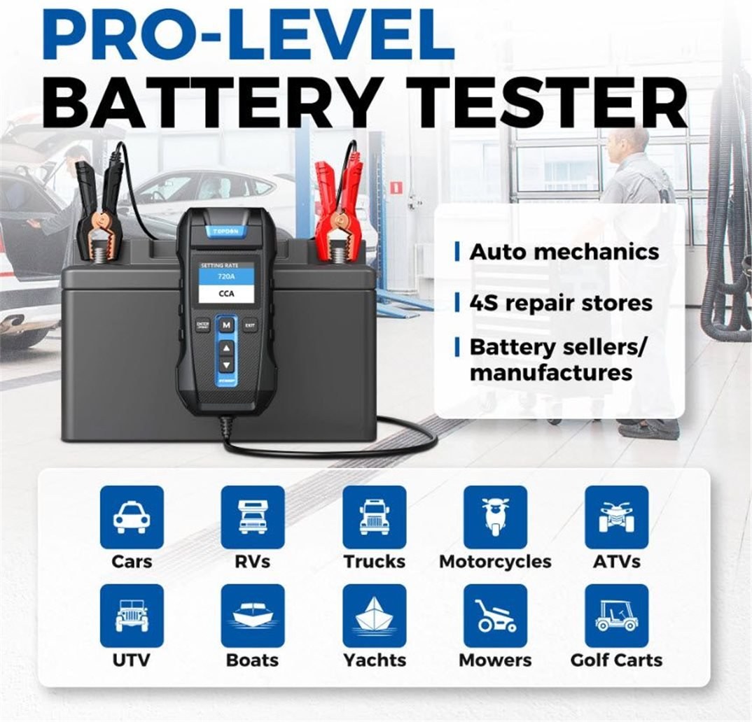 Rozpoznáva zlyhanie štartovacích a nabíjacích systémov v 12 V a 24 V autách, motocykloch, nákladných vozidlách, obytných vozidlách, ATV, terénnych vozidlách, člnoch, jachtách, atď. Väčšina problémov s vozidlom, ktoré sú spôsobené chybnou batériou, je možné vyriešiť s prístrojom BT300P.