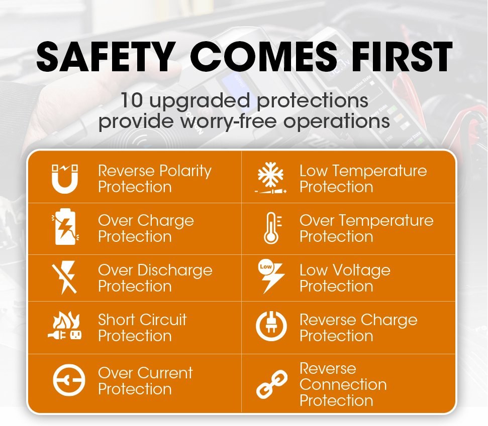 Ďalšou výhodou tohto modelu je jeho špičkové spracovanie, spoľahlivosť, odolnosť, prehľadný LCD displej, pevné a odolné štartovacie klipy so zabudovanou ochranou proti prepólovaniu, bezdrôtové nabíjanie, optimálna ergonómia pre bezpečné držanie a kvalitné gumové tesnenie konektorov na používanie zariadenia aj za dažďa.