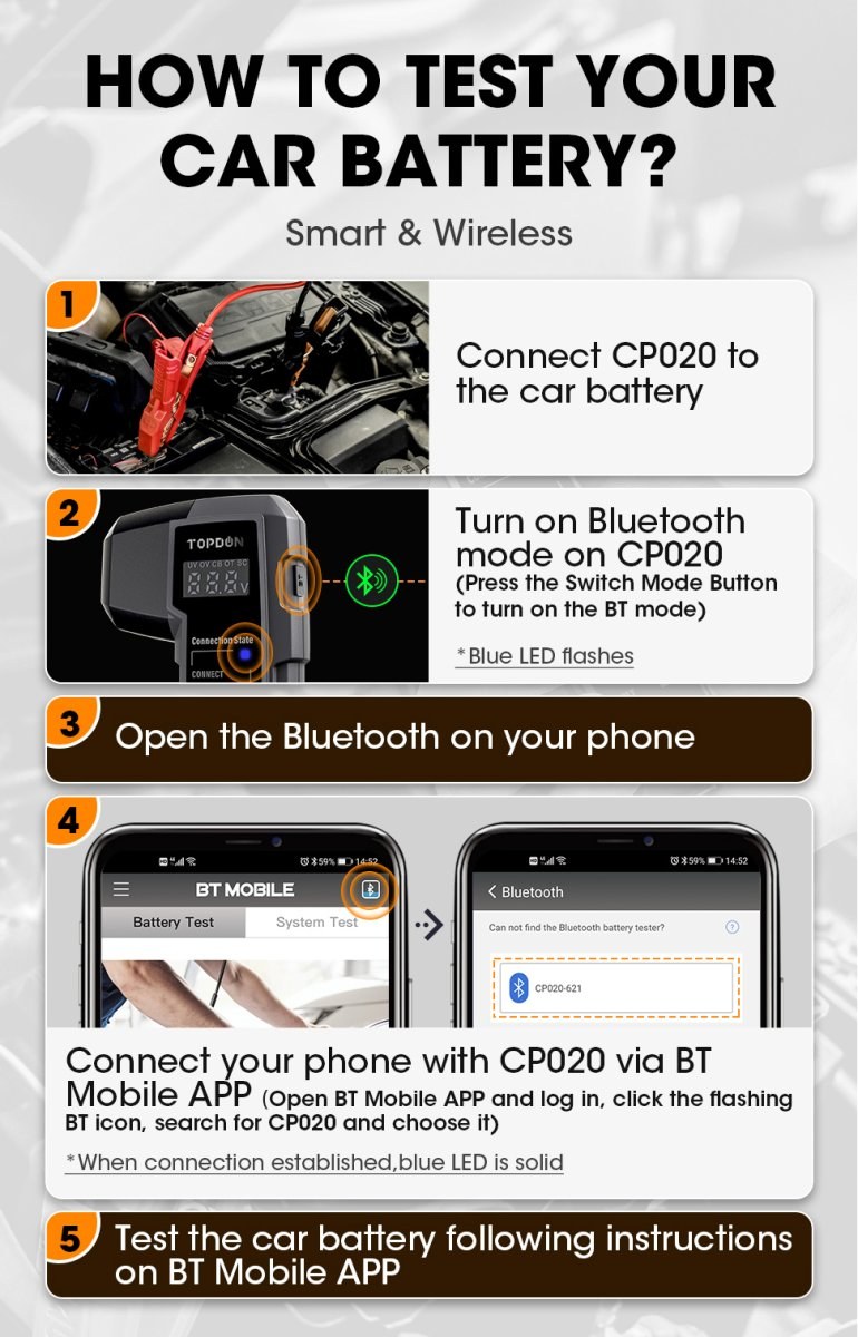 Chytré štartovacie káble CP020 môžete využiť aj ako kvalitný tester batérií, ktorý Vám poskytne presné výsledky o aktuálnom stave meranej batérie, štartovacieho a nabíjacieho systému prostredníctvom bezdrôtového pripojenia Bluetooth s našou aplikáciou "BT MOBILE".