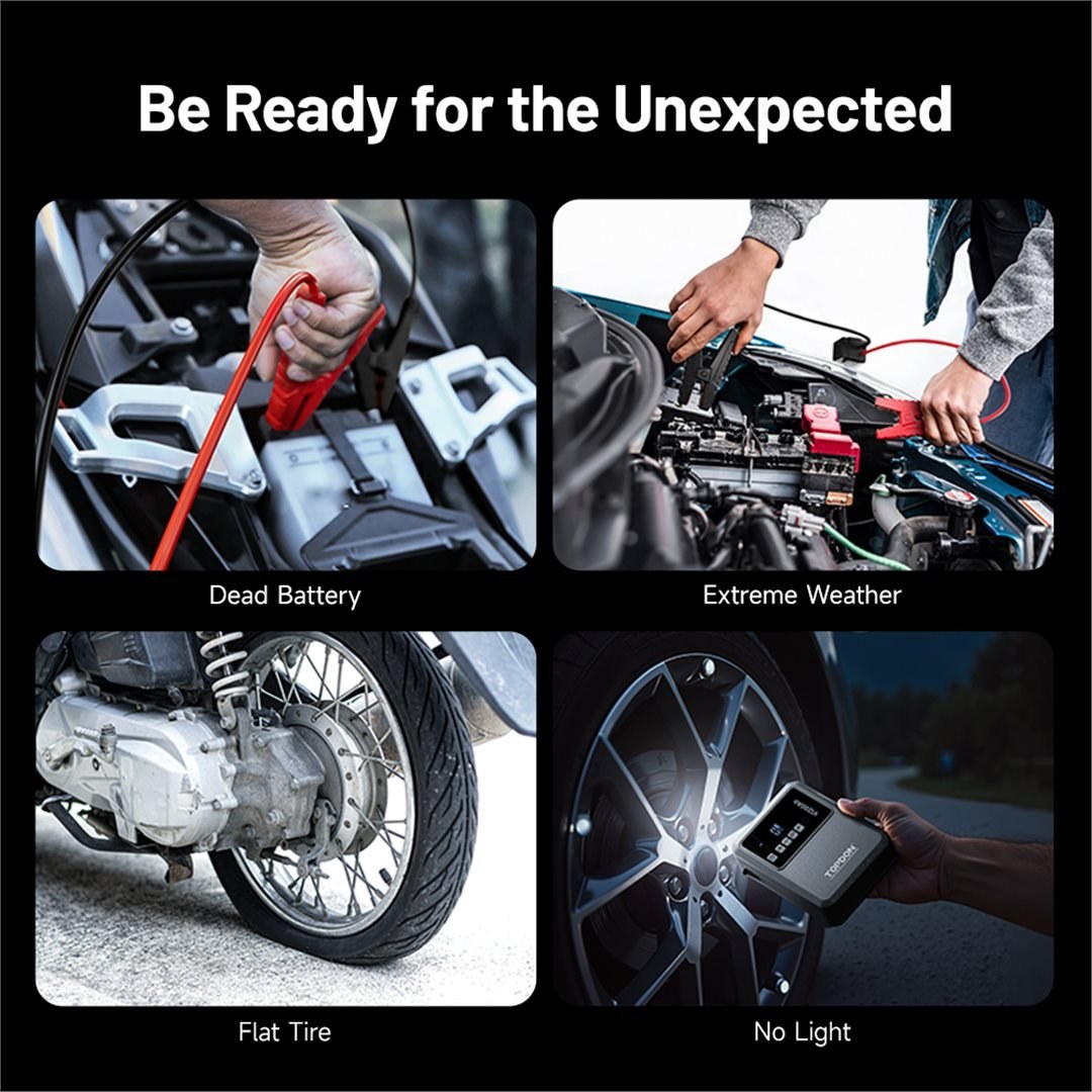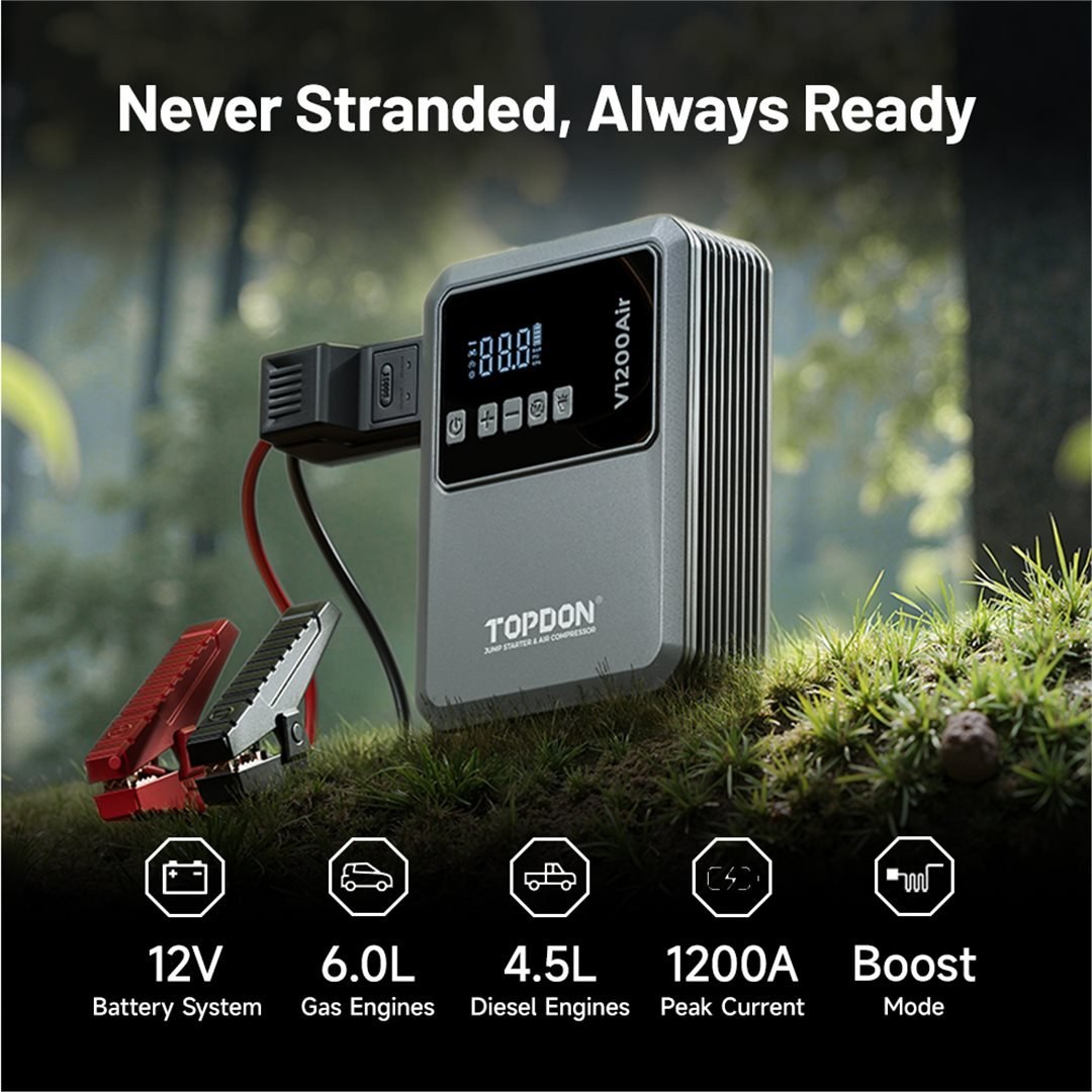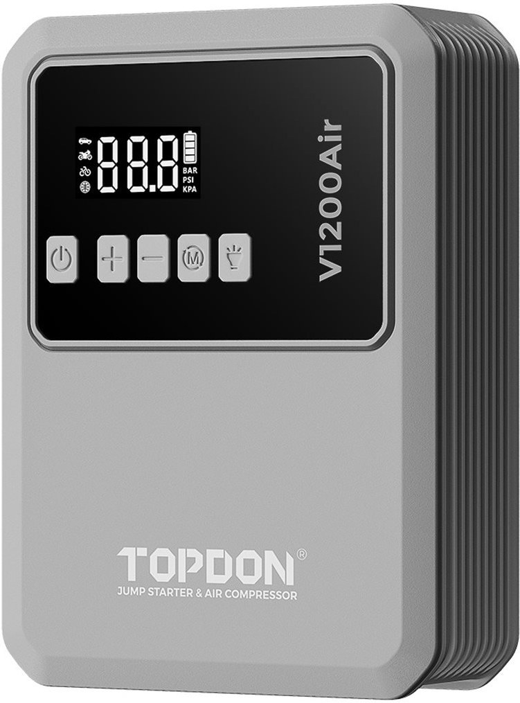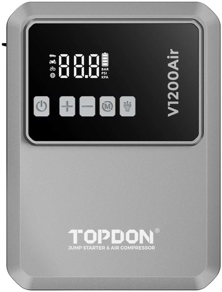 TOPDON V1200 Air je multifunkčné zariadenie, ktoré vám ušetrí miesto v kufri aj starosti na cestách. Vďaka štartovaciemu prúdu 1200 A spoľahlivo naštartuje 12V vozidlá - osobné autá, motorky, SUV aj menšie dodávky. Už sa nemusíte obávať vybitých batérií, pretože pomoc je vždy po ruke. S podporou motorov až do 6,0 l benzínu alebo 4,5 l nafty vám V1200Air umožní jednoducho vyraziť v priebehu niekoľkých minút.Integrovaný kompresor