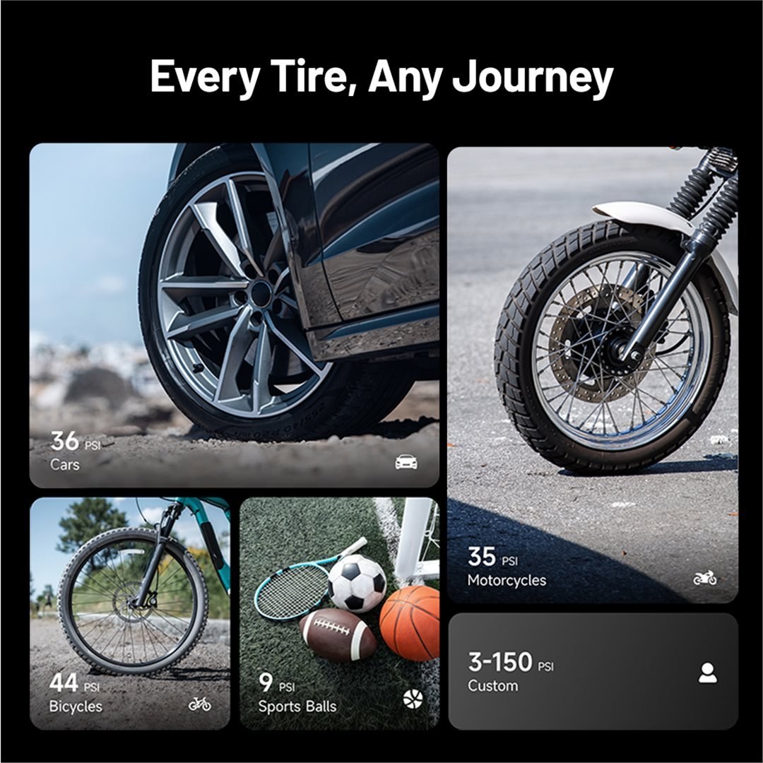 Maximálny tlak 150 PSI nafúkne pneumatiky auta, motorky aj bicykla a nechýbajú ani adaptéry pre športové vybavenie či nafukovacie doplnky. Na prehľadnom LCD displeji ľahko nastavíte požadovaný tlak a kompresor sa sám zastaví po dosiahnutí zadanej hodnoty.Výkonná powerbanka