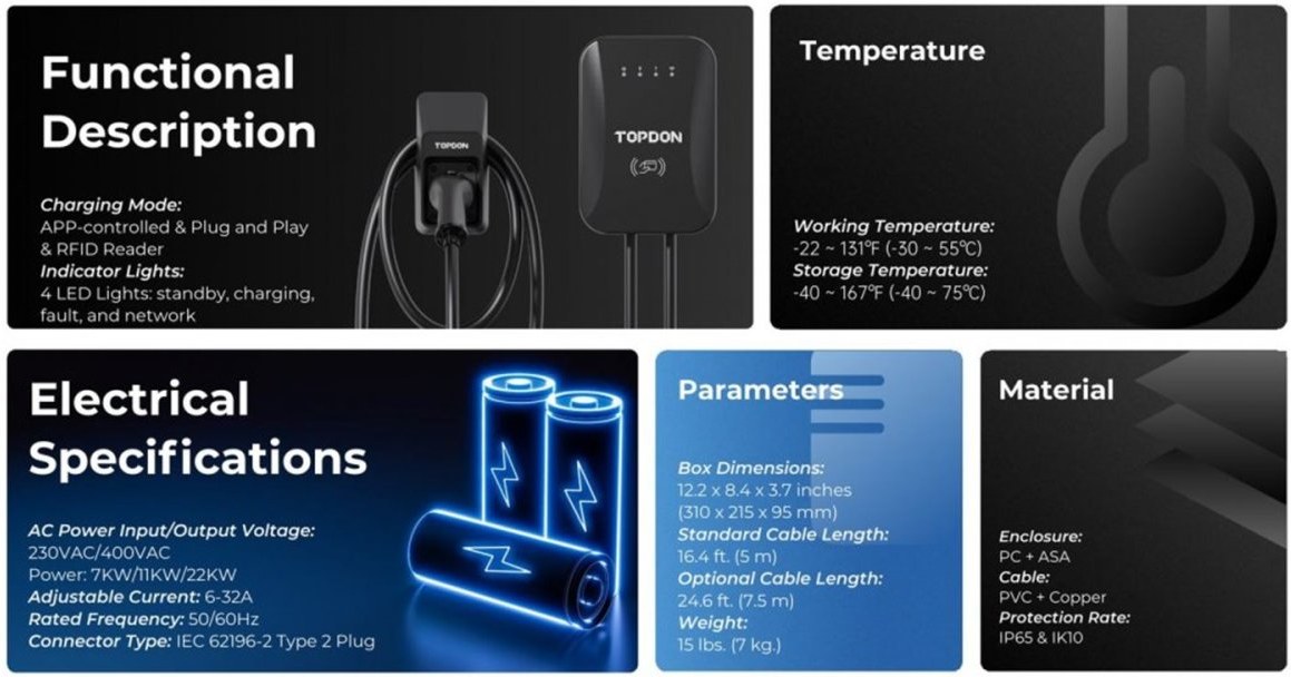TOPDON PulseQ AC Home 22kW je nabíjacia stanica pre elektromobily, ktorá umožňuje rýchle a efektívne nabíjanie vášho vozidla v prostredí Vášho domu.Táto nabíjačka je vybavená výkonným a spoľahlivým 22kW meničom, ktorý umožňuje nabíjať elektromobily takmer 10x rýchlejšie ako bežné zásuvky. Navyše je TOPDON PulseQ 22kW kompatibilný s väčšinou elektromobilov na trhu, vrátane značiek Tesla (potreba adaptéra), Audi, BMW, Volkswagen a ďalších. Vďaka týmto vlastnostiam je TOPDON PulseQ 22kW skvelou voľbou pre tých, ktorí chcú ľahko a pohodlne nabíjať svoj elektromobil v domácom prostredí.