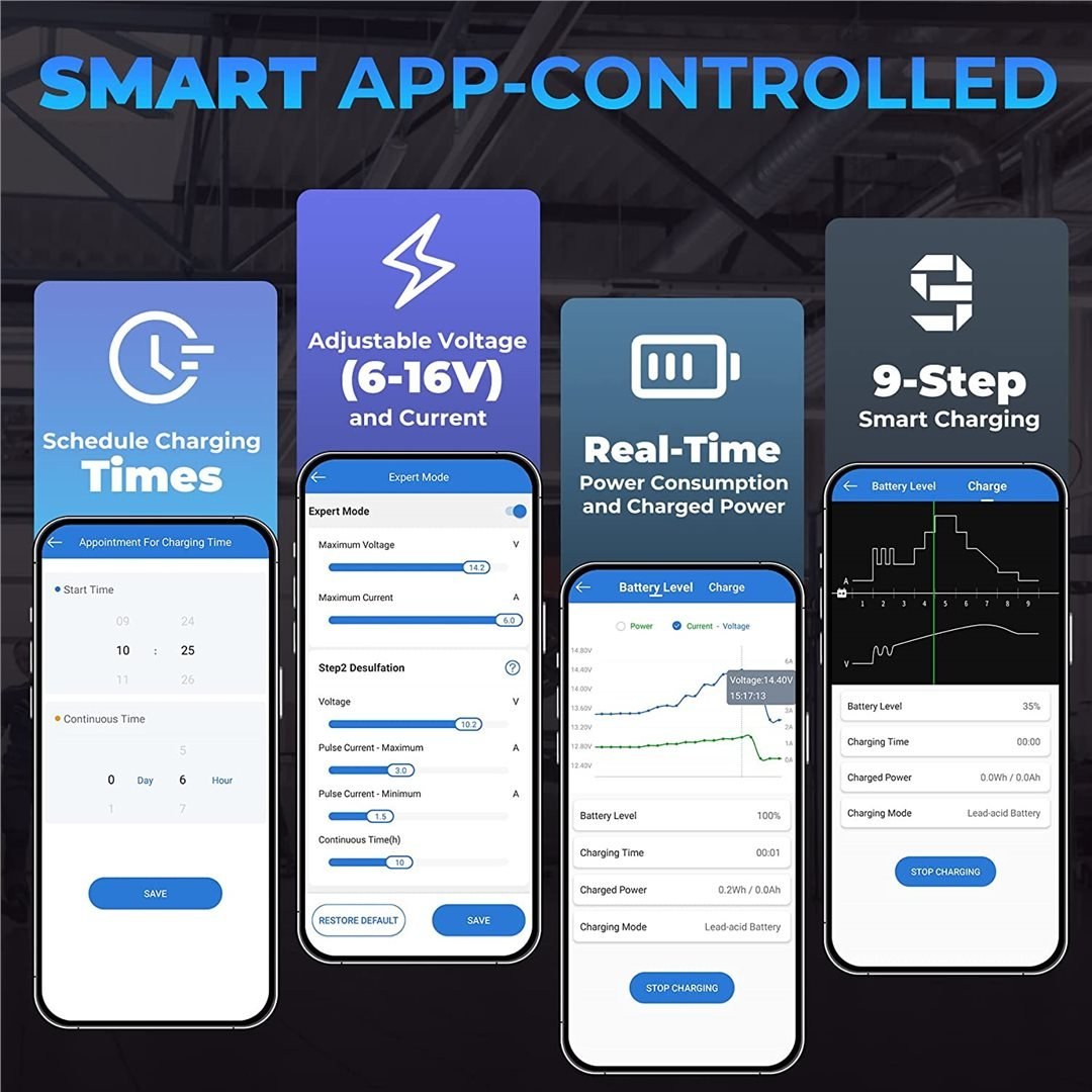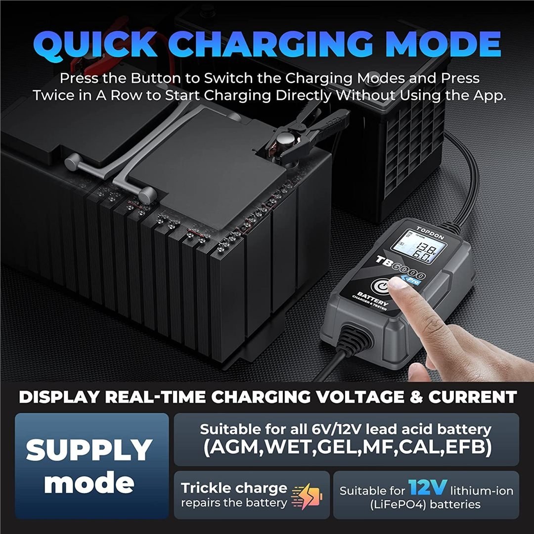 Kompatibilný so všetkými typmi 6V a 12V olovo-kyselinových batérií a 12V lítiových batérií (LiFePO4). Podporuje aj viac typov batérií: LI, zaplavené, gélové, MF, CAL, EFB, AGM.TB6000Pro dokáže nabíjať Vaše batérie až v 6 nabíjacích režimoch: