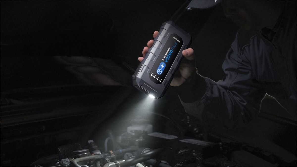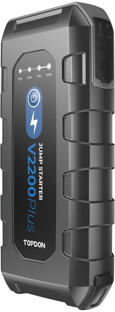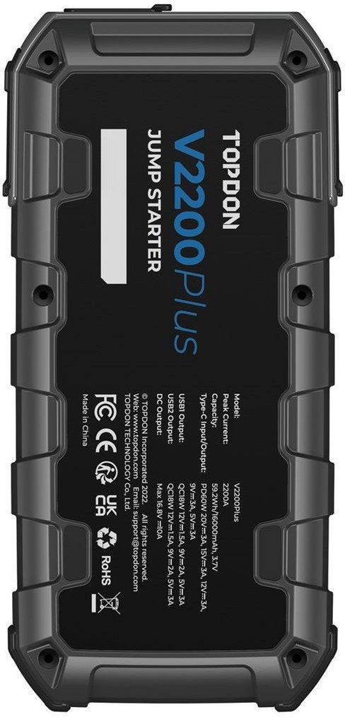 Jump starter s testrom barérií v jednom. Štartovací prúd až 2200A. Naštartuje dieselové motory do objemu až 6.0L, benzínové motory do objemu až 8.0L a to opakovane v závislosti od objemu Vášho motora. Inteligentná aplikácia cez Bluetooth vám poskytne základnú diagnostiku stavu vašej batérie a nabíjacieho okruhu batérie. Štartovací zdroj na naštartovanie 12V osobných a nákladných vozidiel, lodí, motocyklov, skútrov, pickupov, atď.V2200Plus je štartovací zdroj, ktorý sa postará a zabráni neočakávaným situáciám. Na plné nabitie zvládne až 35 štartovacích cyklov. Disponuje šikovnými svorkami, ktoré zabraňujú možným bezpečnostným rizikám. Je vybavený vstavaným 300lm LED svetlom a Bluetooth modulom pre testovanie 12V batérií. Po spárovaní s aplikáciou poskytuje cranking test, test batérie a tým informuje o jej stave ešte predtým, než sa úplne vybije a tým jej životnosť úplne skončí. V220Plus taktiež plní funkciu powerbanky s kapacitou 16000mAh/59Wh.