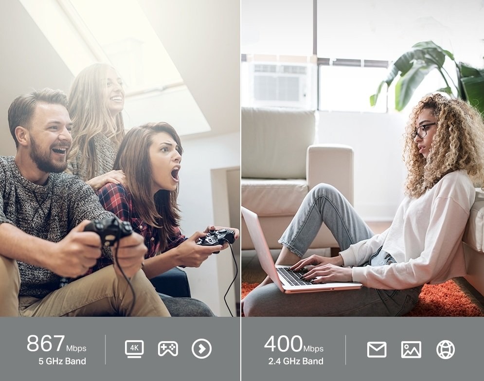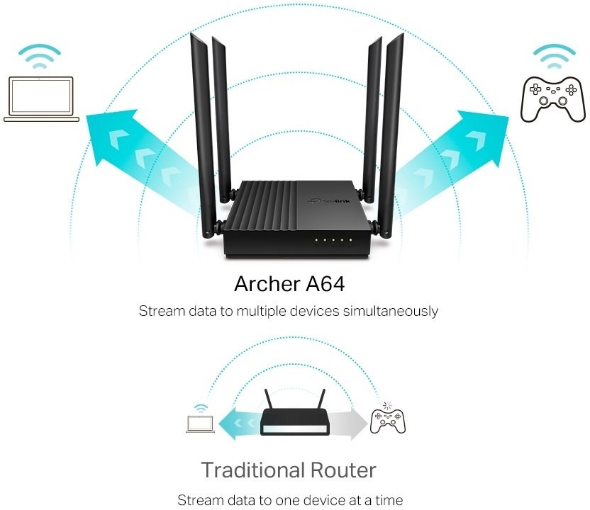 TP-Link Archer A64 je dvojpásmový Wi-Fi router navrhnutý pre domácnosti, ktoré požadujú rýchle a spoľahlivé bezdrôtové pripojenie. Vďaka podpore štandardu Wi-Fi 5 (802.11ac) poskytuje kombinovanú rýchlosť až 1200 Mb/s – 867 Mb/s v pásme 5 GHz a 300 Mb/s v pásme 2,4 GHz. To znamená plynulé streamovanie videí vo vysokom rozlíšení, hranie online hier bez oneskorenia a rýchle sťahovanie súborov.