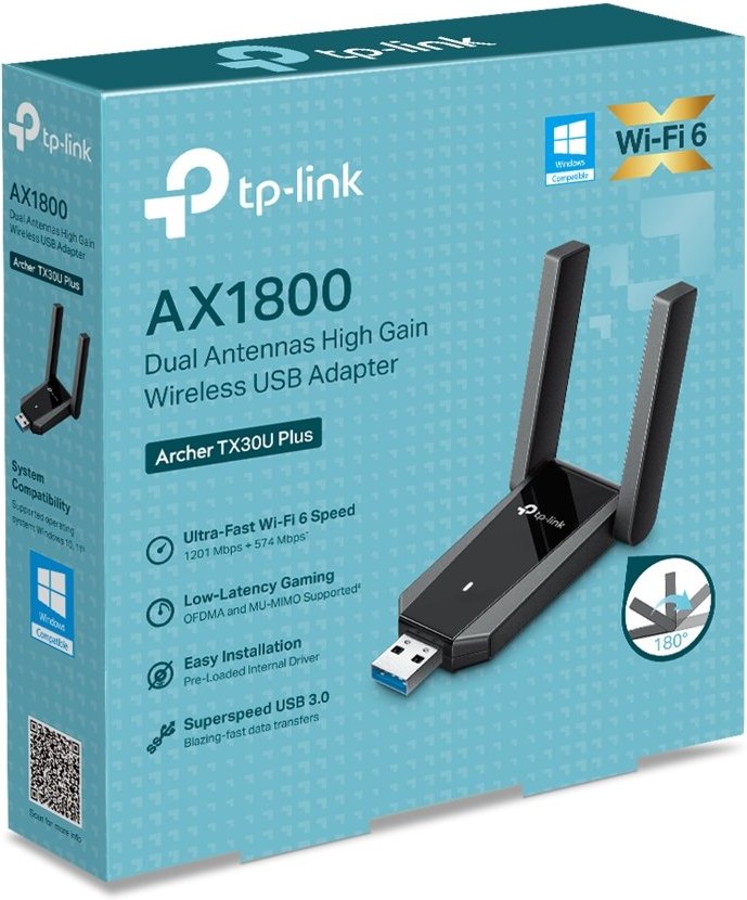 TP-Link Archer TX30U Plus je moderný bezdrôtový USB adaptér, ktorý využíva najnovší štandard Wi-Fi 6 (802.11ax). Vďaka dvom pásmam – 5 GHz s rýchlosťou až 1201 Mbit/s a 2,4 GHz s rýchlosťou až 574 Mbit/s – poskytuje celkovú kombinovanú rýchlosť až 1800 Mbit/s. To znamená plynulé streamovanie videí vo vysokom rozlíšení, rýchle sťahovanie veľkých súborov a bezproblémové hranie online hier bez oneskorení. Adaptér je ideálny pre používateľov, ktorí požadujú vysoký výkon a stabilitu pripojenia.