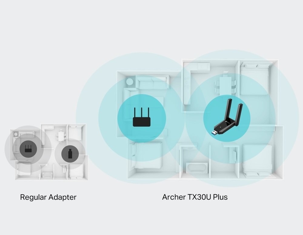 Zariadenie je vybavené dvoma externými anténami s vysokým ziskom, ktoré spolu s technológiou Beamforming zabezpečujú silný a stabilný signál aj na väčšie vzdialenosti. Beamforming sústreďuje signál priamo na smer vášho routera, čím sa zvyšuje kvalita pripojenia a znižuje riziko výpadkov. Vďaka tomu je Archer TX30U Plus vhodný aj do väčších domácností alebo kancelárií, kde je potrebné pokryť viac miestností.