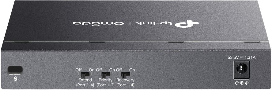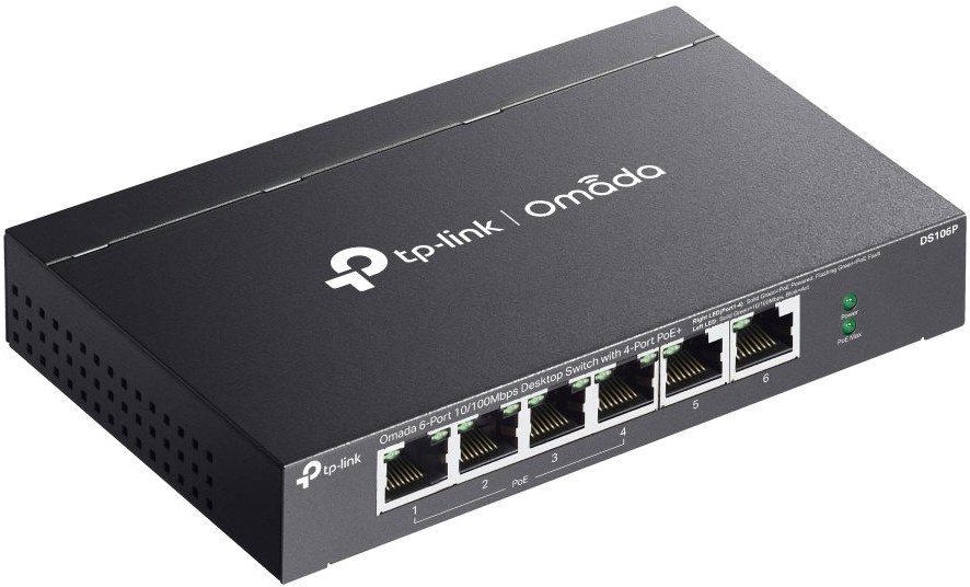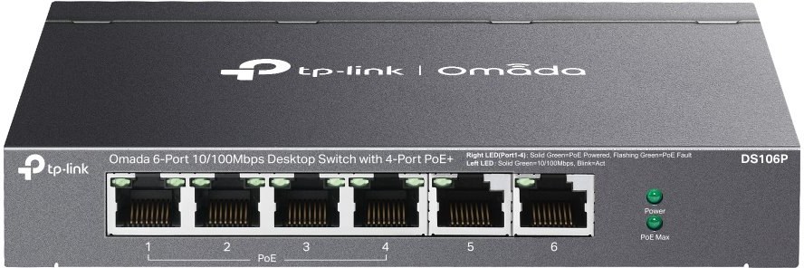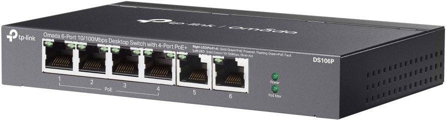 Počet portov: 6× RJ45 (10/100 Mbps), z toho 4× PoE+PoE štandard: IEEE 802.3af/at
