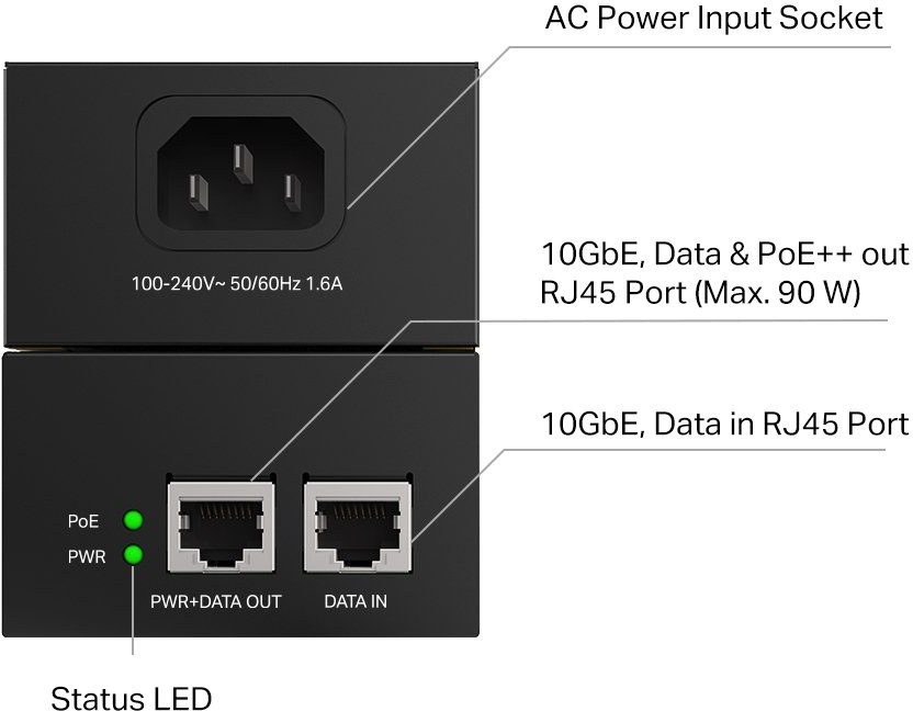 • 1× 10 Gbps/5 Gbps/2,5 Gbps/1 Gbps/100 Mbps/10 Mbps RJ45 napájanie + dáta- výstupný port (Max. 90 W)