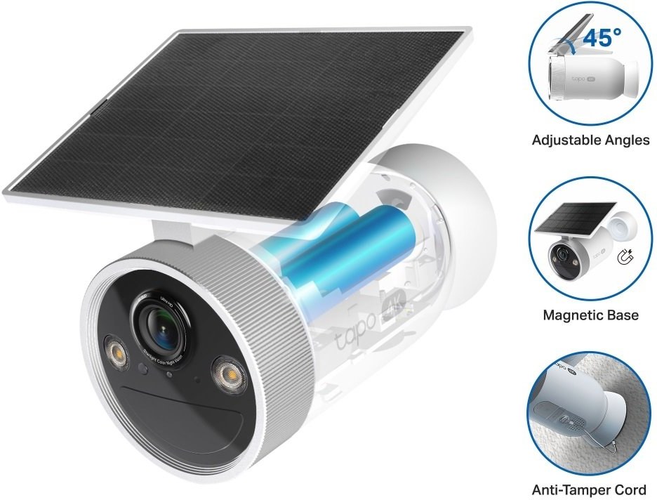 Tapo C465 je vonkajšia bezpečnostná kamera s integrovaným solárnym panelom, ktorá kombinuje bezdrôtové napájanie s vysokým rozlíšením 4K UHD (8 MP). Poskytuje až štyrikrát jasnejší obraz než štandardné 1080p kamery, vďaka čomu zachytíte aj tie najmenšie detaily – od poznávacích značiek vozidiel až po rysy tvárí. Nabíjanie solárnym panelom dokáže zabezpečiť energiu pre celodenný chod už po približne 50 minútach priameho slnečného svetla, čo minimalizuje potrebu externého napájania.