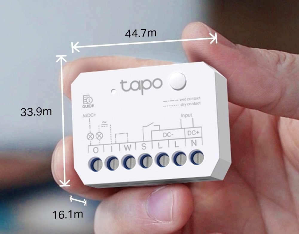 S rozmermi 44,7 × 33,9 × 16,1 mm sa Tapo S110E zmestí aj do najmenších inštalačných krabíc v EÚ. V balení nájdete všetko potrebné pre rýchlu montáž – prepojovacie vodiče, popisky a stručný návod.