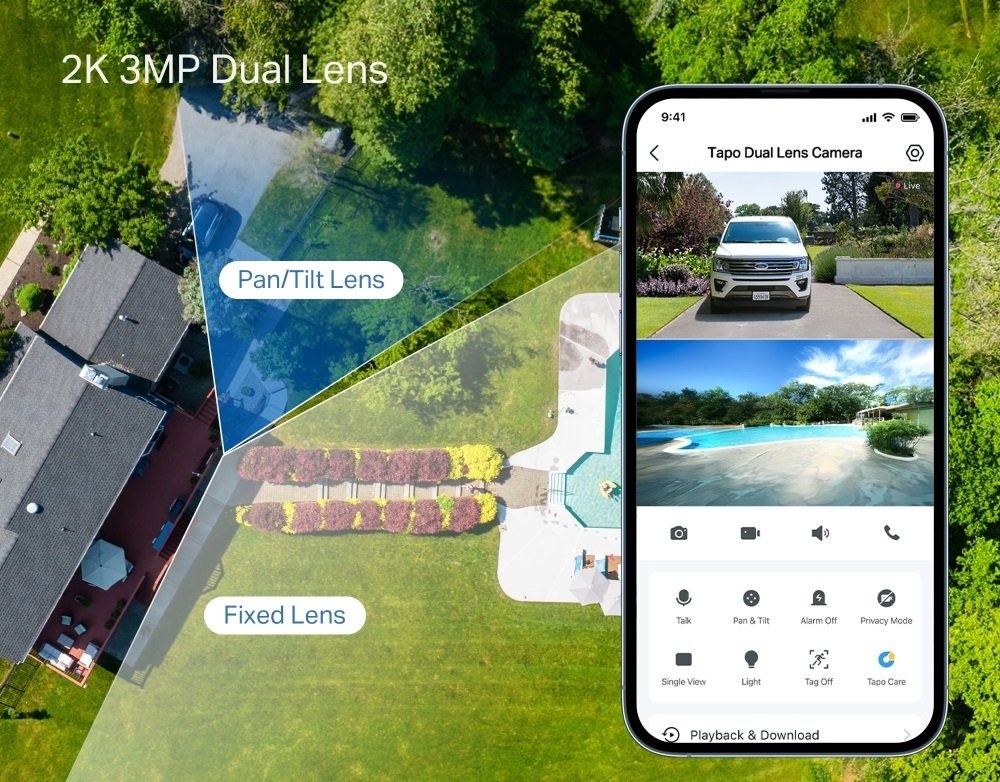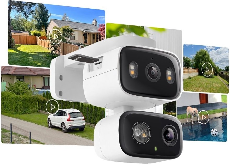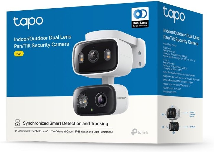 TP-Link Tapo TC34 je inteligentná bezpečnostná kamera, ktorá prináša revolučné riešenie v podobe dvoch objektívov. Horný širokouhlý objektív poskytuje prehľadný záber celej miestnosti alebo vonkajšieho priestoru, zatiaľ čo spodný teleobjektív s funkciou otáčania a nakláňania umožňuje priblížiť detaily. Vďaka tejto kombinácii získate komplexný dohľad bez slepých miest.