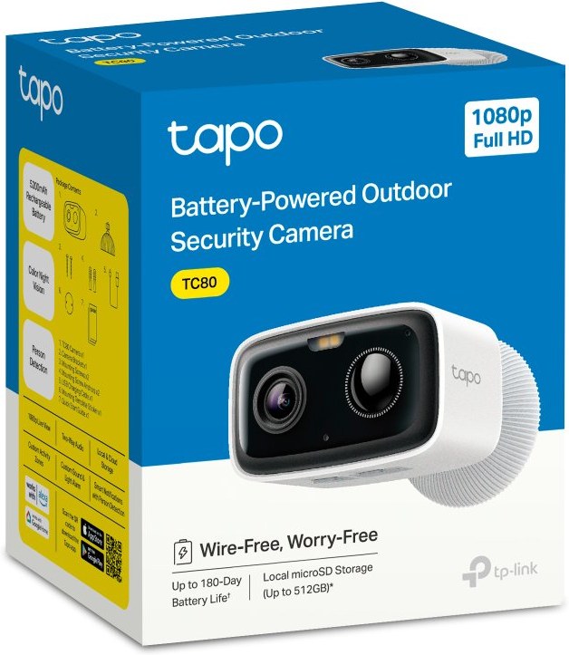 Kamera je navrhnutá tak, aby odolala nepriaznivému počasiu – jej IP65 krytie zabezpečuje ochranu pred dažďom, prachom a snehom. Vďaka 128-bitovému AES šifrovaniu a podpore SSL/TLS protokolov je prenos dát maximálne zabezpečený. TC80 je kompatibilná s Google Assistant, Amazon Alexa a Tapo aplikáciou, čo umožňuje jednoduché ovládanie a integráciu do smart domácnosti.