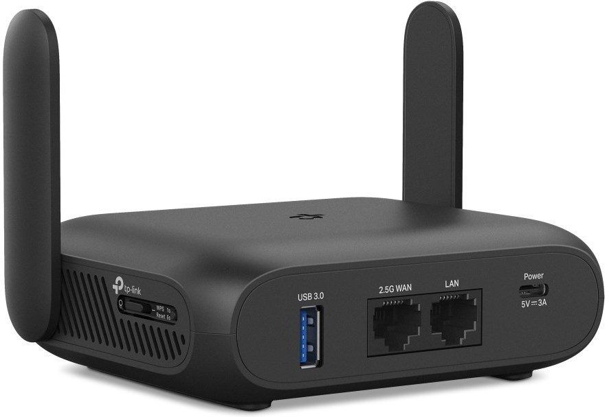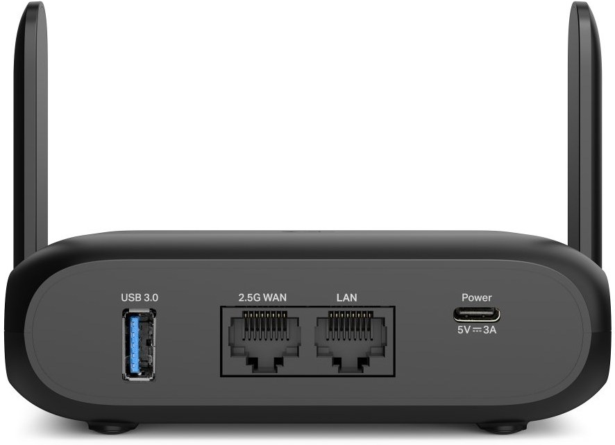 Na káblovej strane ponúka router 1× 2,5 Gb/s WAN a 1× 1 Gb/s LAN port, vďaka čomu vie využiť rýchle pripojenia aj v hotelových sieťach či doma. USB-C napájanie umožňuje spustiť zariadenie nielen zo sieťového adaptéra, ale aj z powerbanky, takže internet máte po ruke aj mimo zásuvky. K dispozícii je aj USB 3.0 port – pripojením externého disku môžete jednoducho zdieľať súbory v lokálnej sieti, prípadne použiť USB 4G/5G modem alebo telefón cez tethering ako zdroj internetu.