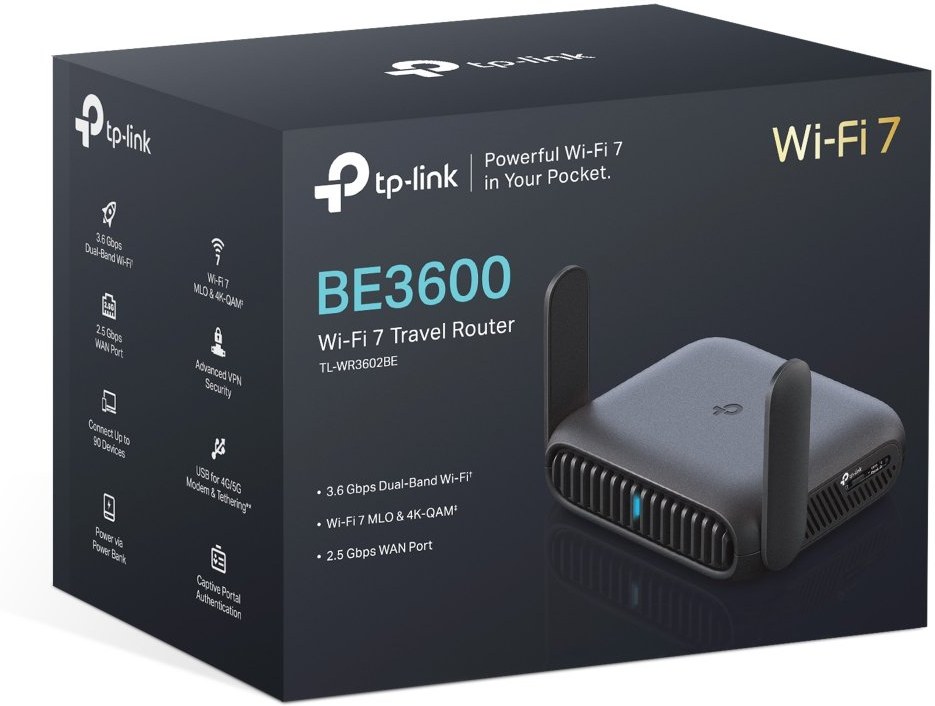 TP-Link TL-WR3602BE (BE3600) je prenosný Wi-Fi 7 router navrhnutý tak, aby vám poskytol stabilné a rýchle pripojenie doma, v hoteli aj na cestách. V duálnom pásme dosahuje kombinovanú rýchlosť až 3,6 Gb/s – približne 2882 Mb/s v 5 GHz a 688 Mb/s v 2,4 GHz – takže zvládne streamovanie videa, online hranie aj súbežné sťahovanie bez výpadkov. Kľúčové technológie Wi-Fi 7, ako 160 MHz kanály, 4K-QAM, Multi-Link Operation (MLO) a Multi-RUs, zvyšujú priepustnosť, skracujú latenciu a zlepšujú spoľahlivosť v náročnom rušivom prostredí. Všetko je ukryté v kompaktnom, odolnom tele pripravenom do vrecka či batohu.