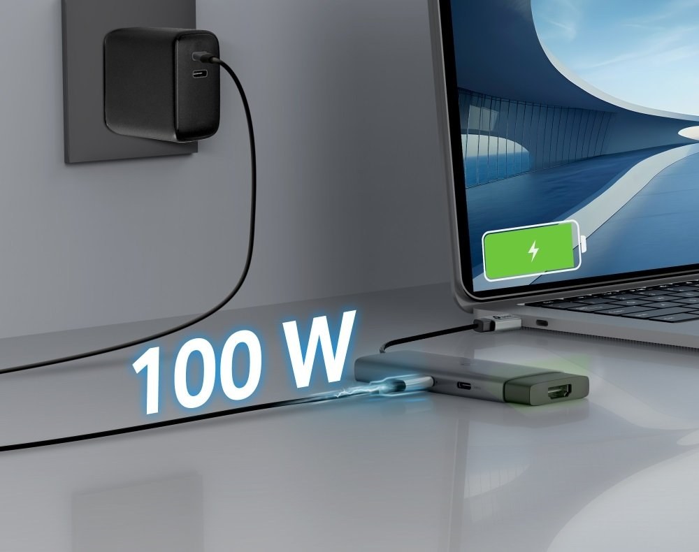 pripojenie cez USB-C, HDMI, USB-C, USB-A, pripojenie max. jedného monitora, 4K, aktívne napájanie, power delivery 100W, materiál kovZobraziť viac