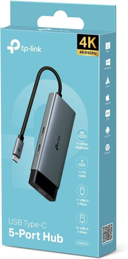 TP-Link UH5020C je kompaktný a výkonný USB-C rozbočovač, ktorý premení jeden USB-C port na päť praktických rozhraní. Vďaka tomu získate prístup k HDMI výstupu s rozlíšením až 4K pri 60 Hz, 100W Power Delivery nabíjaniu, USB-C dátovému portu a dvom USB-A portom s podporou vysokorýchlostného prenosu dát. Tento rozbočovač je ideálny pre používateľov, ktorí potrebujú rozšíriť možnosti svojho notebooku, tabletu alebo smartfónu bez kompromisov v rýchlosti či kvalite.