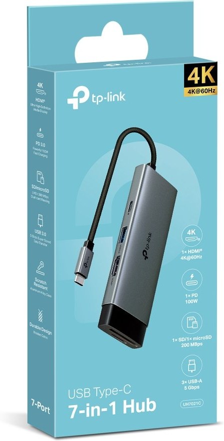 TP-Link UH7021C je kompaktný a výkonný USB-C rozbočovač typu 7v1, ktorý premení jeden USB-C port na sedem rôznych rozhraní. Zariadenie ponúka HDMI výstup s podporou rozlíšenia až 4K pri 60 Hz, čítačku SD a microSD kariet s vysokou prenosovou rýchlosťou, tri USB-A porty s rýchlosťou 5 Gb/s a USB-C port s podporou napájania až 100 W. Vďaka tomu je ideálnym riešením pre používateľov, ktorí potrebujú rozšíriť možnosti svojho notebooku, tabletu alebo smartfónu bez kompromisov.