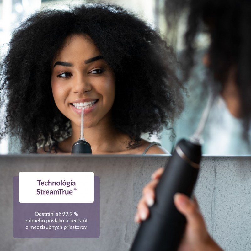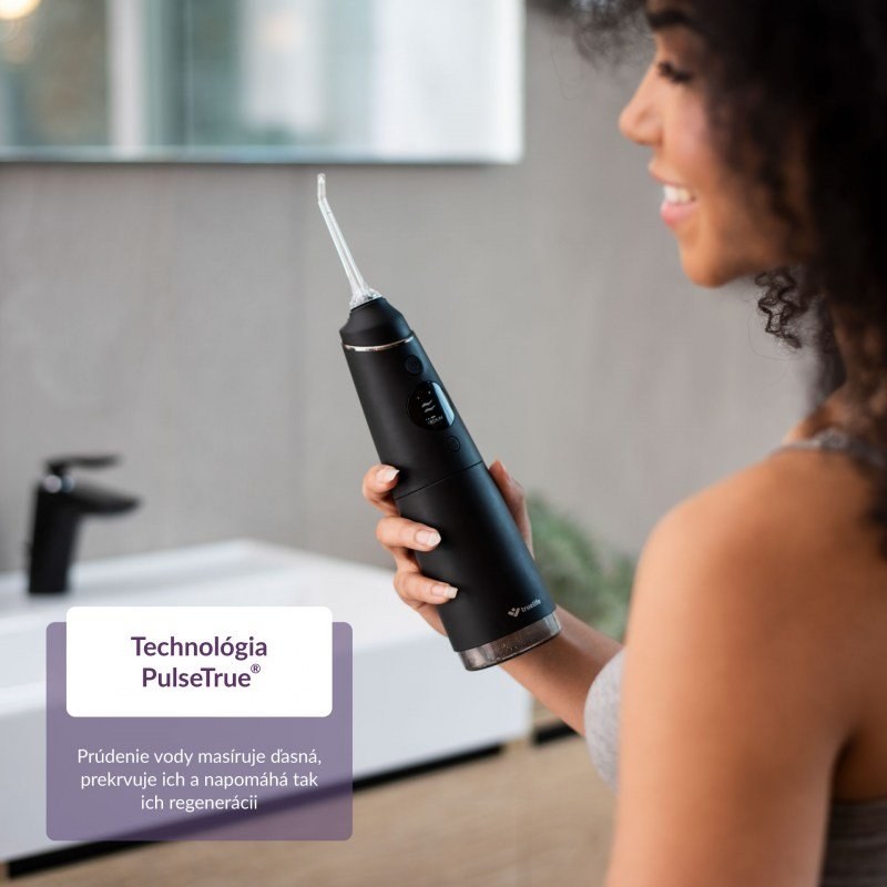 Úplná väčšina zubných kazov vzniká v medzizubných priestoroch. Ich pravidelné čistenie je preto nutnosť. Býva ale zdĺhavé a často nie úplne príjemné. S ústnou sprchou TrueLife AquaFloss Compact C300 je čistenie medzizubných priestorov o mnoho jednoduchšie a šetrnejšie. Vďaka technológii StreamTrue® prúd kvapiek vody a vzduchu, ktorý vychádza z trysky ústnej sprchy, dokonale prenikne aj do najmenších priestorov, kde účinne odstraňuje až 99 % zubného povlaku i baktérií. Vďaka kompaktnému dizajnu a výdrži batérie môžete so sprchou bez obáv cestovať. Jej používanie je ľahké a vyžaduje minimum nácviku. Sprcha ponúka 5 režimov čistenia s rôznymi intenzitami tlaku, vrátane režimu Pulse s technologiou PulseTrue®, vďaka ktorej prístroj masíruje ďasná, prekrvuje ich a napomáha tak ich regenerácii. Vďaka funkcii DIY si môžete vytvoriť vlastný režim čistenia, v ktorom si zvolíte intenzitu tlaku vody, ktorá vám bude najviac vyhovovať. Prístroj má 6 špeciálnych trysiek, ktoré sú navrhnuté pre vaše konkrétne potreby.