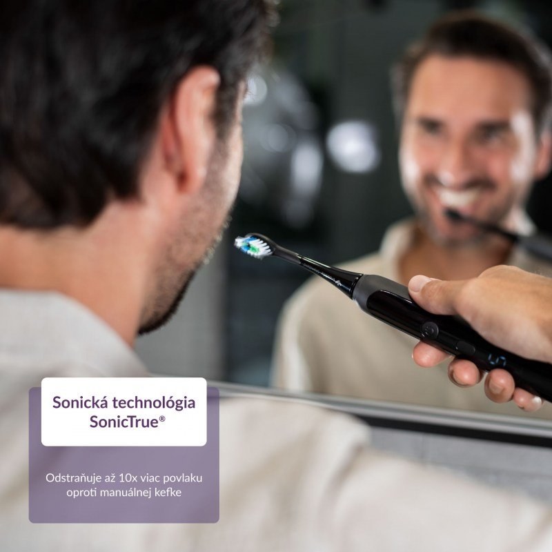 Sonická technológia SonicTrue® funguje na báze jemných vibrácií, pri ktorých štetiny kefky kmitajú vysokou rýchlosťou a efektívne odstraňujú zubný povlak. 80 000 pohybov za minútu vháňa vodu so zubnou pastou i do medzizubných priestorov a jemné vibrácie nedajú šancu povlaku, škvrnám ani baktériám. Sonická technológia je navyše šetrnejšia ku zubnej sklovine, než manuálne čistenie alebo rotačné kefky.