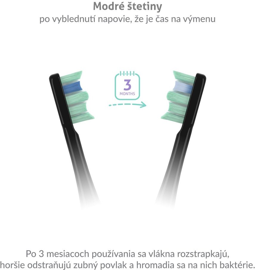 Opotrebované štetiny kefky sa štiepia, strácajú účinnosť a hromadia sa na nich baktérie. Hlavice sonickej kefky sú osadené modrými štetinami, ktoré po 3 mesiacoch zbelejú a upozornia vás tak na nutnosť výmeny.