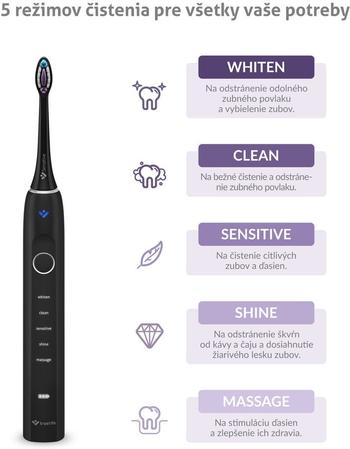 Stačí jediná kefka pre vyriešenie najrôznejších ťažkostí. Balenie sonickej kefky TrueLife SonicBrush Clean70 UV Black zahŕňa 2 hlavice. Standard pre každodenné čistenie a Sensitive s extra jemnými štetinkami na citlivé zuby. Dokúpiť možno aj hlavicu Whiten na bielenie zubov. Hlavice však nie sú jedinými pomocníkmi pri starostlivosti o zuby a ďasná, svoju prácu vykoná aj 5 režimov čistenia. S bežným čistením si poradí režim Clean, o citlivé zuby a ďasná sa postará režim Sensitive, pre žiarivý lesk a odstránenie škvŕn od čaju a kávy použite režim Shine, o odstránenie odolného zubného povlaku a vybielenie zubov sa stará režim Whiten, ak chcete zlepšiť zdravie ďasien a stimulovať ich, režim Massage je tým pravým.