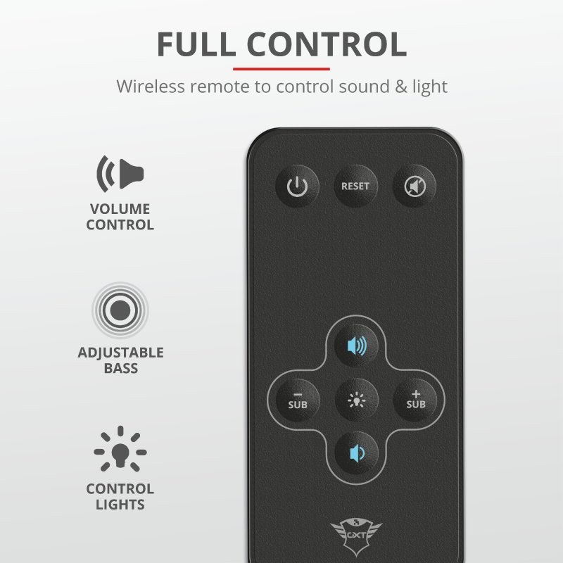 Na ovládanie tohto výkonného zvukového zariadenia je dodávané praktické bezdrôtové diaľkové ovládanie. Jedným kliknutím na tlačidlo môžete jednoducho nastaviť a stlmiť hlasitosť, jemne doladiť basy, zmeniť svetlá a zapnúť alebo vypnúť reproduktor.
