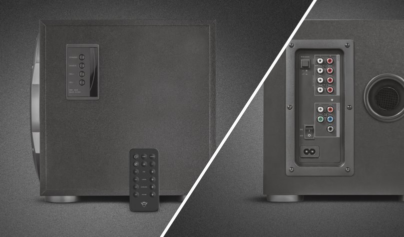 Bezdrôtový diaľkový ovládač umožňuje meniť hlasitosť, zdroj (pripojenie AUX alebo 5.1), svetlo, priestorový zvuk reproduktorov, hlasitosť subwoofera a stredový reproduktor. Na to nemusíte vstávať zo stoličky! Na bočnom paneli subwoofera môžete tiež zapnúť/vypnúť systém reproduktorov, ovládať hlasitosť a meniť zdroj.
