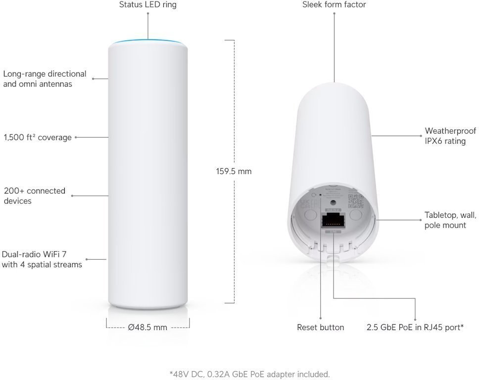 Zariadenie je vybavené portom 2,5GbE s podporou napájania PoE a dosahuje maximálnu rýchlosť 4,3 Gbps v pásme 5 GHz (BW240) a 688 Mbps v pásme 2,4 GHz (BW40). Vďaka certifikácii IPX6 je plne odolné voči poveternostným vplyvom pri vonkajšom použití s dodávaným držiakom. Kompaktné rozmery 159,5 × 48,5 × 48,5 mm a hmotnosť iba 313 g umožňujú inštaláciu prakticky kdekoľvek.