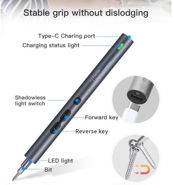 Skrutkovač je napájaný 3,6 V batériou s kapacitou 330 mAh, ktorú nabijete pomocou kábla USB-C. Po úplnom nabití dokáže zaskrutkovať až 300 skrutiek. Vďaka voľnobežným otáčkam 200 ot/min a krútiacemu momentu až 0,35 N.m pracujete hladko, rýchlo a bez námahy.Tri integrované LED diódy zabezpečujú dobrú viditeľnosť aj za zhoršených svetelných podmienok.