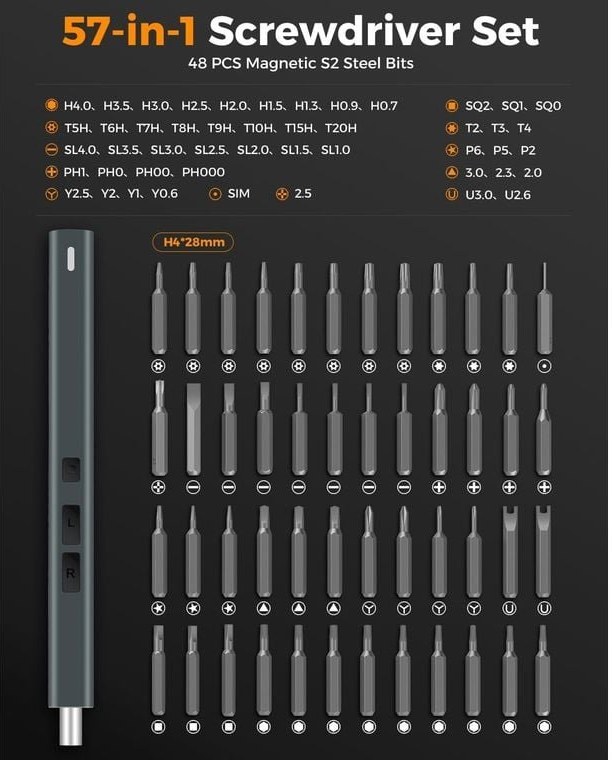 Elektrický skrutkovač 57v1 so 48 magnetickými bitmi je profesionálny nástroj navrhnutý špeciálne na jemné práce, ako sú opravy elektroniky, počítačov, notebookov, smartfónov alebo herných konzol. Vďaka svojej všestrannosti, dlhej výdrži batérie a širokému sortimentu príslušenstva je ideálnou voľbou pre technikov, domácich majstrova všetkých, ktorí chcú mať dokonalú kontrolu nad každou skrutkou.Prečo si zaobstarať tento skrutkovač?