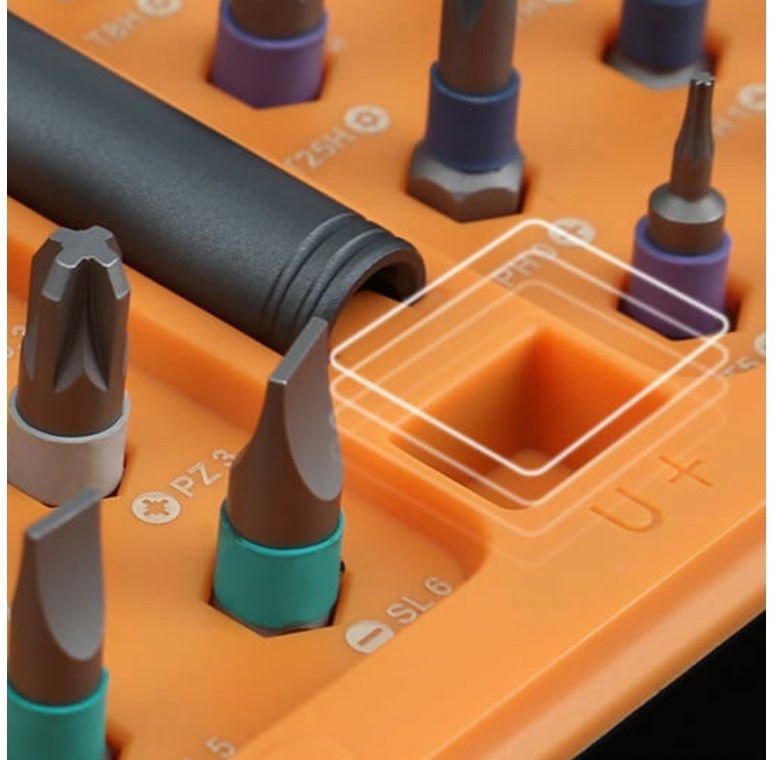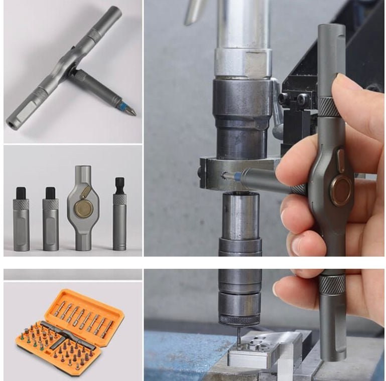 Silný magnet v hlave drží bity pevne na mieste, zatiaľ čo farebné označenie jednotlivých bitov uľahčuje orientáciu a rýchlu výmenu. Magnetizačná drážka v puzdre navyše umožňuje kedykoľvek opätovne aktivovať magnetizmus slabších bitov. Všetko je uložené v kompaktnej škatuli s dôrazom na prehľadnosť a jednoduché prenášanie.