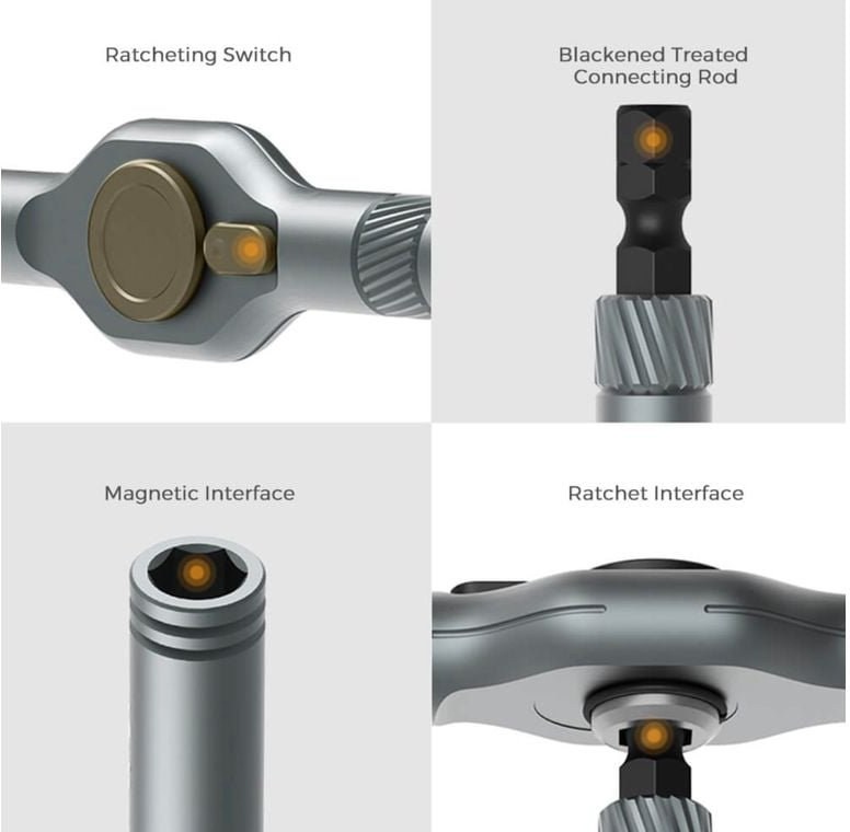 Ráčna rukoväť ponúka 58 zubov s rozstupom len 6,2°, čo zaručuje hladký chod aj v stiesnených priestoroch. Vďaka reverznému spínaču a ergonomickému dizajnu šetrí vaše zápästie až o 80 % viac ako bežné skrutkovače. Hliníkové telo je ľahké, ale mimoriadne odolné – ideálne na každodenné používanie.