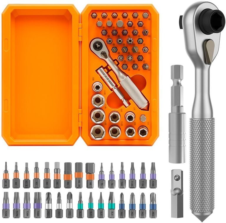 Súprava je vybavená presnou račňou so 72 zubami a minimálnym uhlom otáčania 5°, čo umožňuje prácu aj v stiesnených priestoroch. Samozrejmosťou je dvojitý smer otáčania (prepínanie medzi skrutkovaním a uvoľňovaním). Vďaka materiálom, ako je CR-V (chróm-vanádiová) a CR-MO (chróm-molybdénová) oceľ, odoláva náročným podmienkam a zachováva si dlhú životnosť. Rukoväť s protišmykovým povrchom zabezpečuje pevné a pohodlné uchopenie.